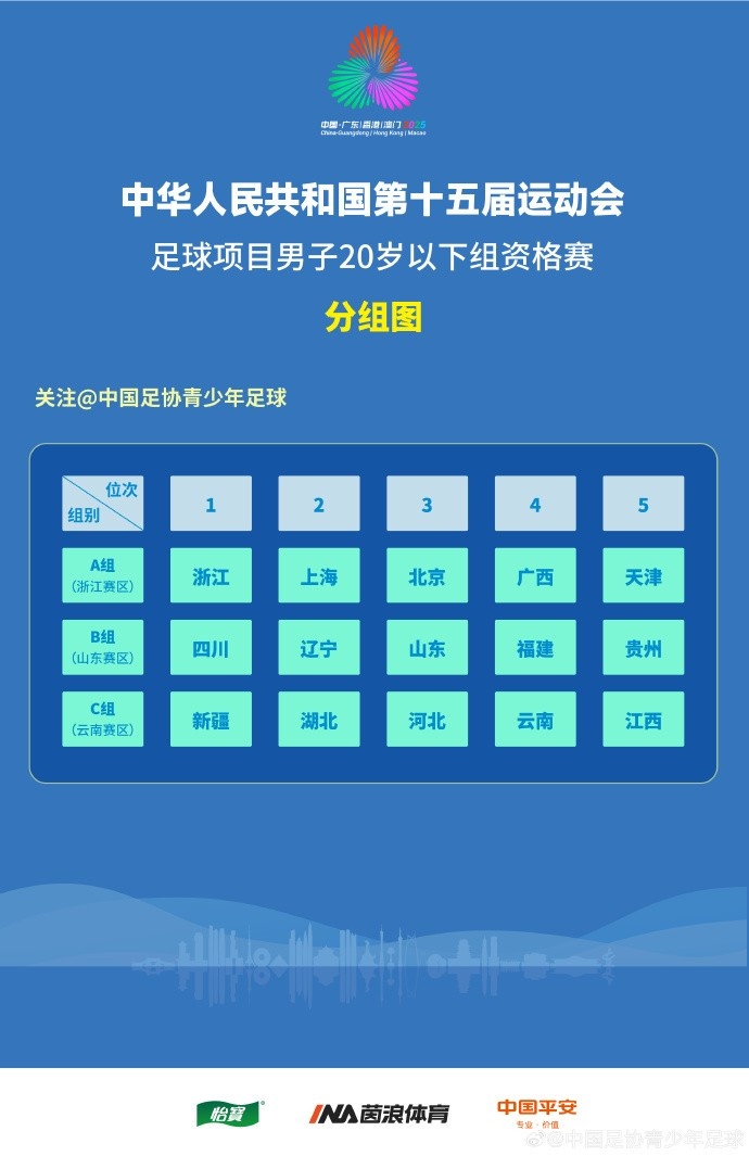 4月16日讯 第15届全运会男足U18组以及U20组资格赛分组抽签结果出炉,U20组方面,浙江、上海、北京同组。