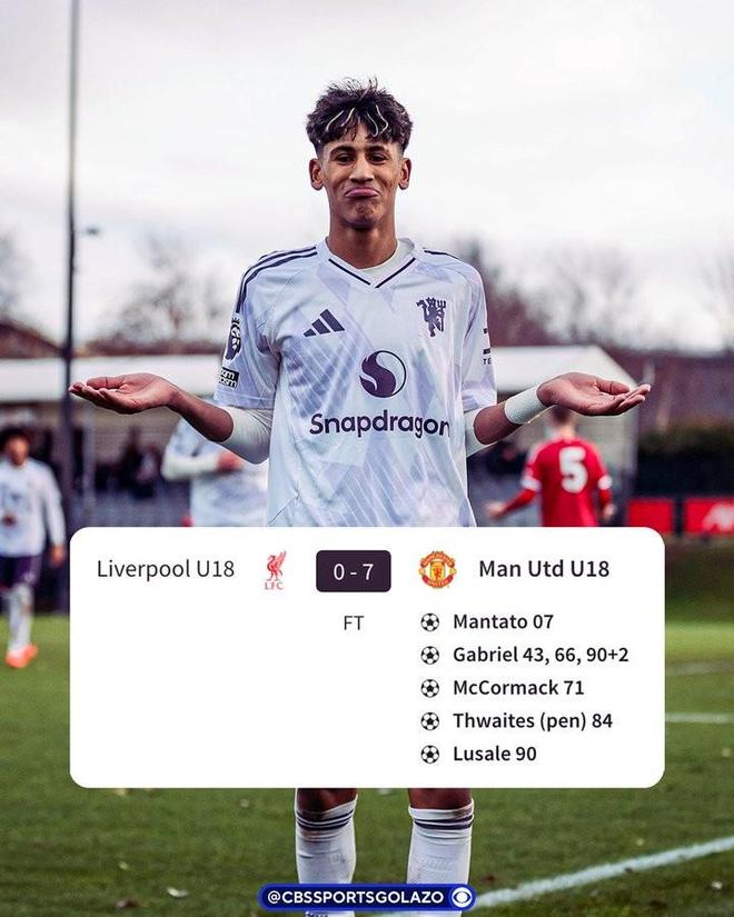 本场比赛,曼塔托、JJ-加布里埃尔(打进3球)、布拉德伯里、吉姆-思韦茨和卢萨莱均取得了进球,帮助曼联U18以7-0的比分大胜利物浦U18,这使得曼联U18升至积分榜第二位。早些时候有报道称,JJ-加布里埃尔参加了曼联一线队的训练,这是由于英超规定,球员必须在8月31日前年满15岁才有资格在本赛季出场,而加布里埃尔上个月才刚满15岁,因此他最早也要明年1月才能出场。【上咪咕独家看英超】