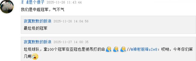 在这篇首尔FC主帅的赛后发言文章的评论区,有某队球迷回复(上图)道:“我们是中超冠军,气不气?”