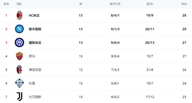 意甲第13轮进行了多场比赛。国际米兰征服客场,以2-0击败比萨。这场比赛国际米兰在场面上占据优势,但是上半场始终无法攻破比萨的大门。直到下半场齐沃派上皮奥-埃斯波西托,国际米兰才收获进球。皮奥-埃斯波西托送出关键助攻,帮助劳塔罗打破僵局。随后,劳塔罗再接再厉,再进一球杀死比赛。国际米兰用一场胜利走出了各项赛事2连败的阴影。梅开二度的劳塔罗无疑是全场最佳。劳塔罗以163粒进球,超越了马佐拉,独占国际米兰队史射手榜第4位。亚特兰大在主场拿下比赛,以2-0击败了佛罗伦萨。这场比赛奥迪隆兜射破门,帮助亚特兰大取得领先。下半场,卢克曼门前抓住机会补射打进,扩大比分。佛罗伦萨虽然全场有15次射门,但射门质量很差,只有3次射正,无法攻破亚特兰大的大门。这场胜利对于亚特兰大来说非常重要,让球队走出了联赛3连败的阴影。佛罗伦萨依然一胜难求,各项赛事8场不胜。罗马在主场倒下了,以0-1输给了卫冕冠军那不勒斯。内雷斯依靠反击机会单刀破门。罗马虽然拥有主场优势,控球率也有优势,但是,创造出的机会并不多,全场也就8次射门,2次射正,无法进球。这场比赛落败,意味着罗马各项赛事4连胜就此终结。而罗马也让出了榜首位置,掉到了第4名。在积分榜上,AC米兰的战绩是8胜4平1负,拿到28分,排名榜首。那不勒斯也是28分,但是,净胜球少1个,只能屈居第2。第3的是国际米兰,9胜4负的战绩,拿到27分。而罗马的战绩和国际米兰一模一样,也是27分,排名第4。冠军的争夺非常激烈,前2积分相同,前4差距最多1分。博洛尼亚和科莫都是24分,排名第5和第6。第7的是尤文图斯,拿到23分。拉齐奥只拿到18分,排名第8。亚特兰大虽然赢球,但是,总积分只有16分,排名第11。