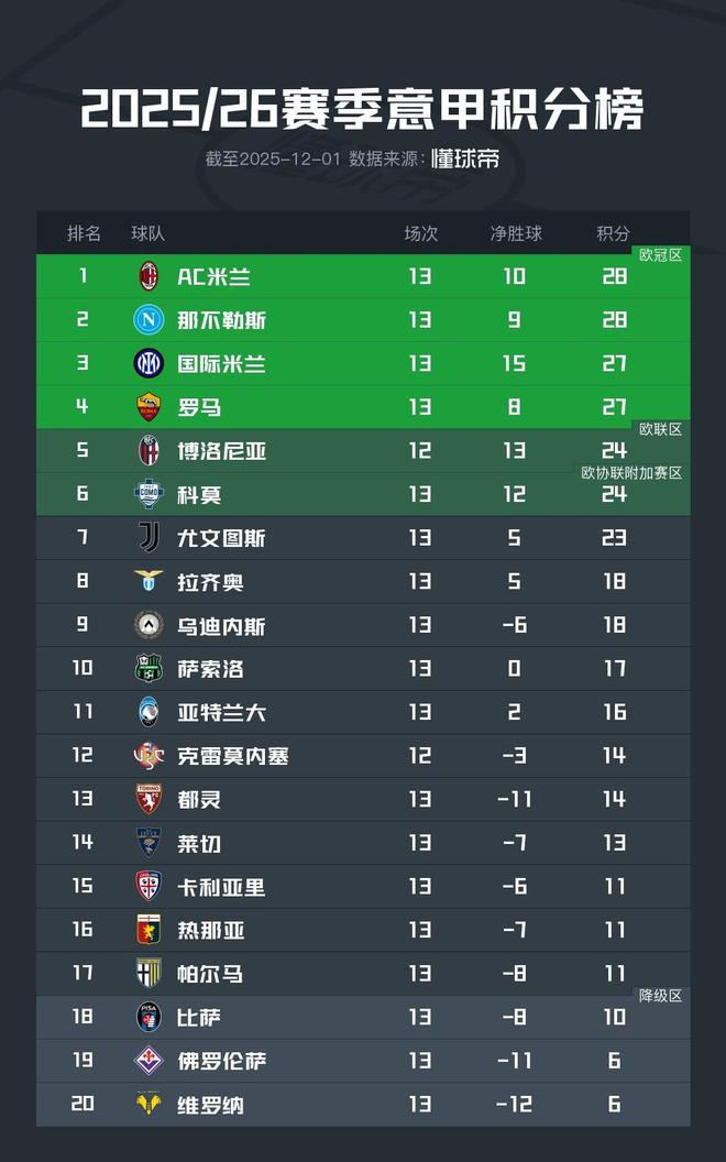 北京时间12月1日,2025/26赛季意甲联赛结束了第13轮的较量,积分榜的形势依然十分胶着。米兰和那不勒斯都在本轮击败了各自的对手并同积28分,前者凭借1个净胜球的优势领跑积分榜,而罗马在输给那不勒斯之后则是和国际米兰同积27分,积分榜前四的球队之间也就只差1分而已。博洛尼亚和科莫的积分都是24分,前者以1个净胜球的优势位列第5,而23分的尤文图斯则仍然排在积分榜的第7分。18分的拉齐奥和乌迪内斯也是两支积分相同的球队,而升班马萨索洛则以17分排在他们身后位列第10,16分的亚特兰大则排在第11。另一支升班马克雷莫内塞也和都灵一样积14分,这两支球队分别排在第12和第13,比他们少一分的莱切位列第14位。卡利亚里、热那亚和帕尔马都是11分,他们都只比降级区高1分,而10分的比萨、6分的佛罗伦萨和维罗纳则是身处降级区。