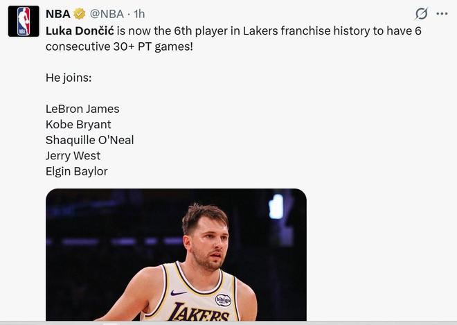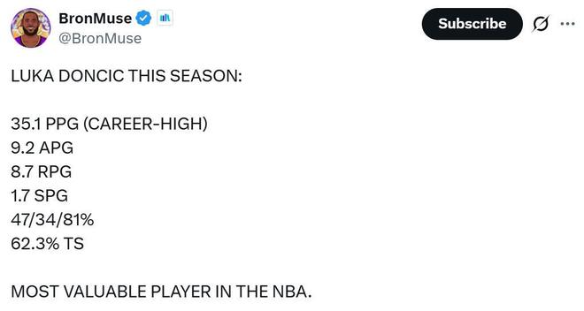 面对东契奇这样的表现,湖人媒体BronMuse也晒出数据点评道:“联盟最有价值球员。”在NBA官方公布的MVP榜单中,东契奇位列第四,而在NBA杯榜单中,东契奇目前领跑高居第一。