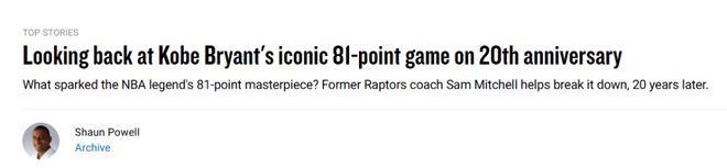 如今的球迷,和NBA官方纪录里那场单场最高分的比赛,已经隔了三四代人的时光。况且1962年的那场比赛,没有照片、没有视频,甚至连一条社媒都没有,只留下一张球员手持写着得分的纸片的定格画面。正因如此,科比的81分,就成了我们这个时代的威尔特-张伯伦100分。