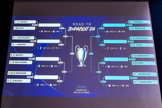 欧冠改制后,联赛阶段前8名直通16强,第9-24名进入附加赛,8支种子队享有先客后主优势。附加赛焦点对阵中,皇马迎战本菲卡、巴黎遭遇摩纳哥、国米对决博德闪耀,其余对决包括纽卡斯尔vs卡拉巴赫、尤文vs加拉塔萨雷、马竞vs布鲁日、亚特兰大vs多特蒙德、勒沃库森vs奥林匹亚科斯。附加赛首回合2月17-18日进行,次回合2月24-25日打响,16强抽签定于2月27日,决赛5月30日在布达佩斯上演。